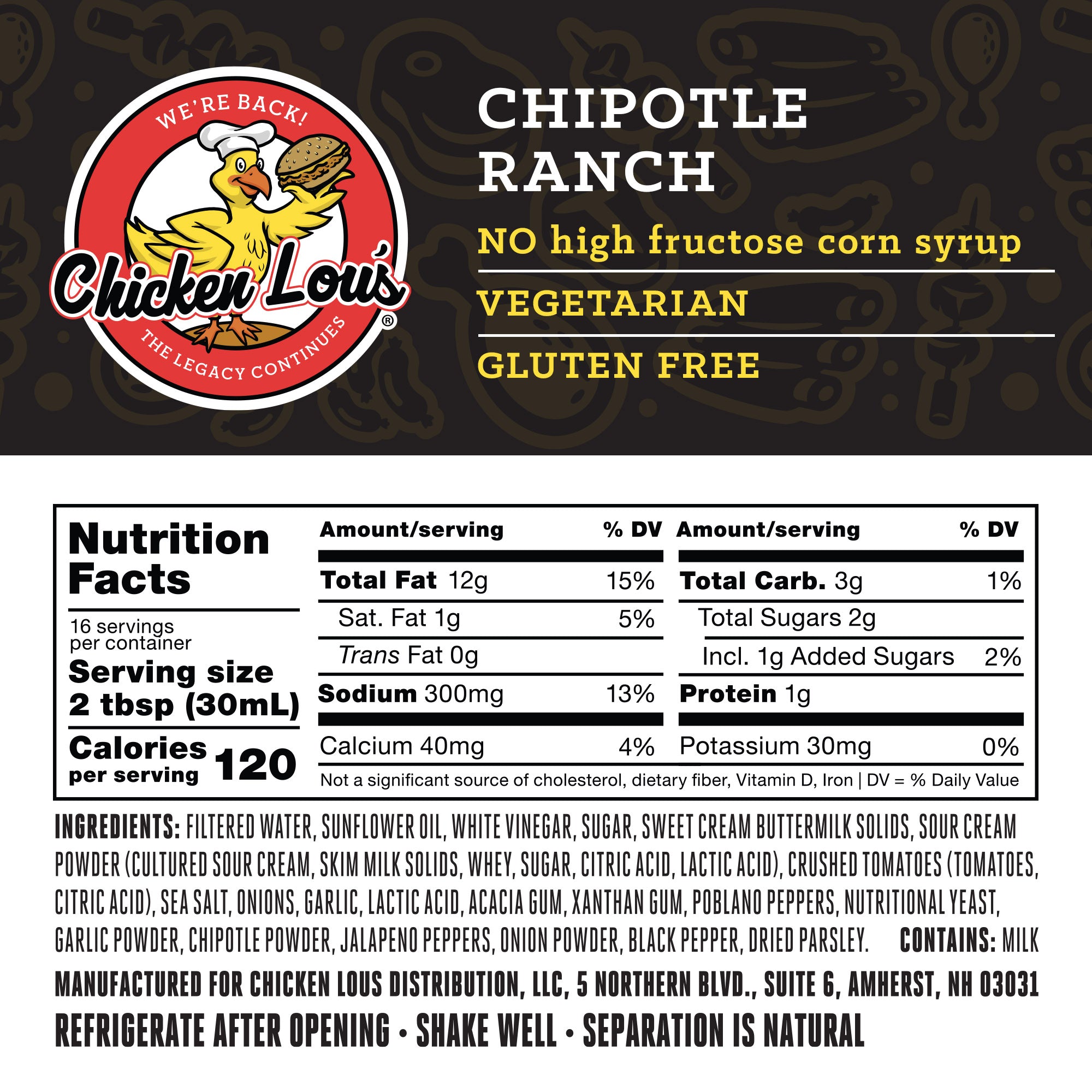 Ranch lovers, unite! A creamy and flavorful ranch dressing that adds the smokey flavor of chipotle peppers for the perfect amount of heat paired with the cool and creamy tang of ranch dressing. Versatile and packed full of flavor, our dressing makes a great dip, marinade, sandwich spread or dressing. The best part? It’s vegetarian, gluten free and sweetened with natural ingredients, no high fructose corn syrup here.