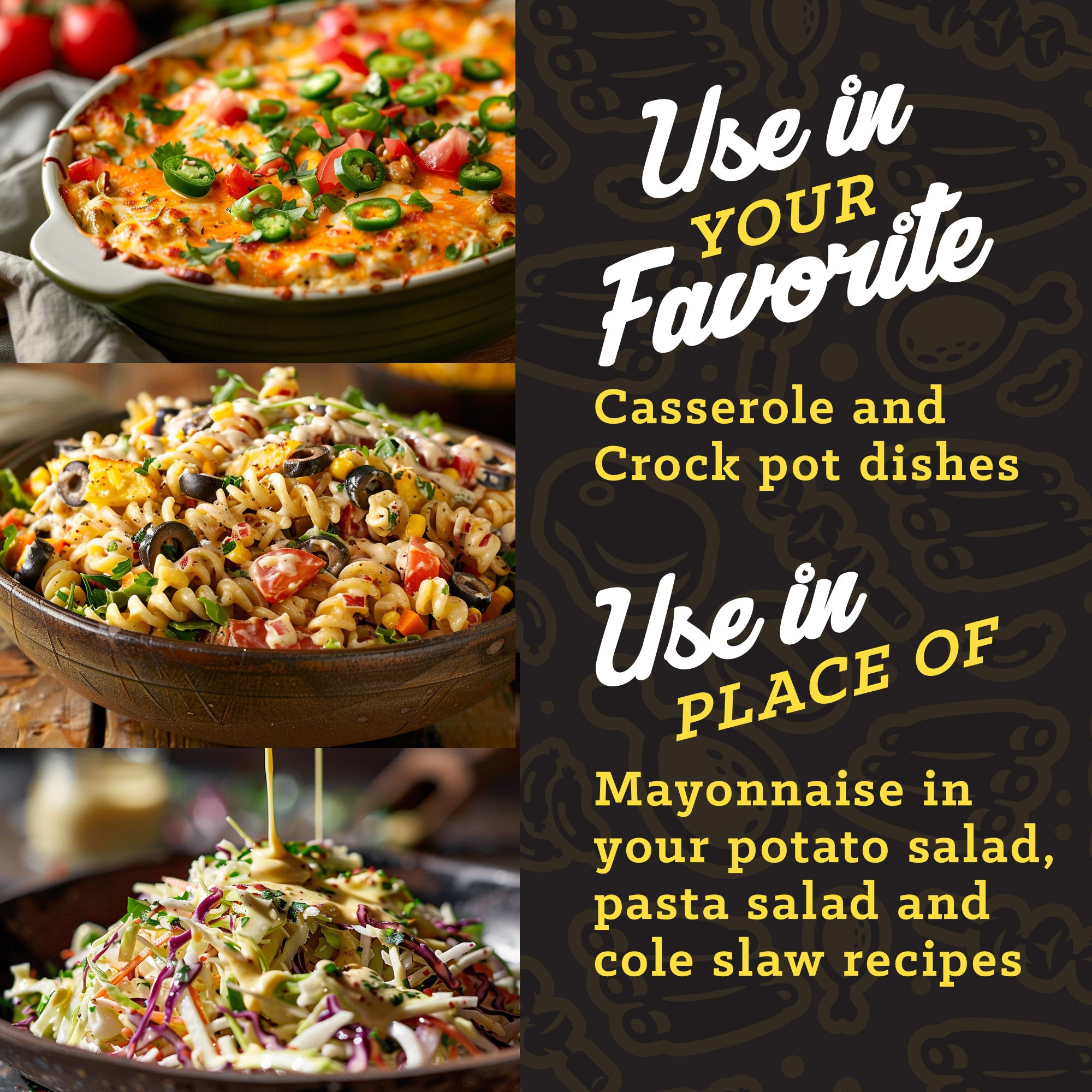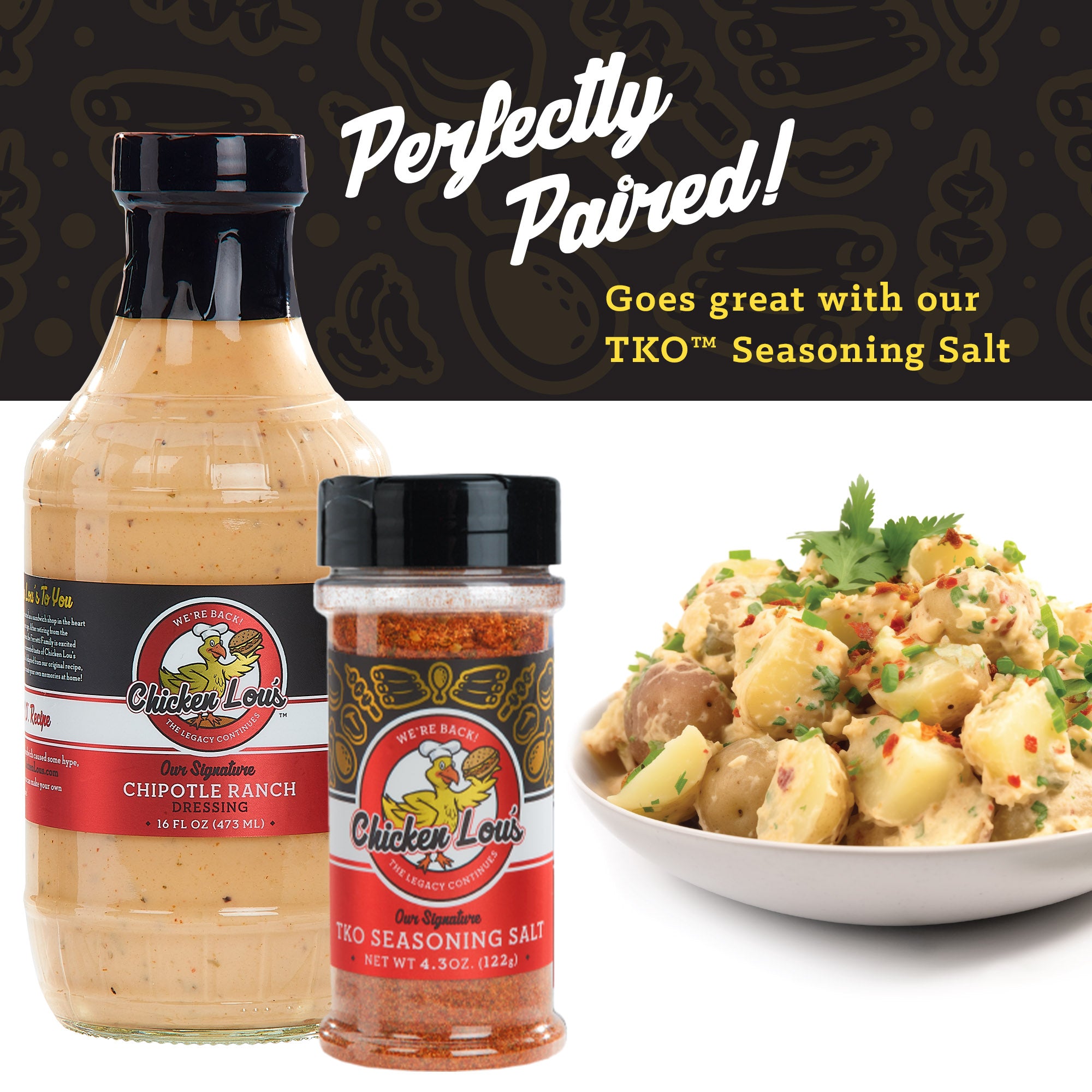 Our Chipotle Ranch is the perfect dip for your veggies, French fries, onion rings, pizza, and chicken tenders! Top your burgers, sandwiches, tacos or nachos with it! It is a great salad dressing or simply add it to your breakfast burrito! Our flavorful sauce makes a great addition to any casserole and crock pot dishes and works well as a marinade for chicken and fish. Replace your mayonnaise in potato salad, pasta salad, or cole slaw with our Chipotle Ranch for an irresistible southwest kick! Pairs perfectly with our TKO™ Seasoning Salt!